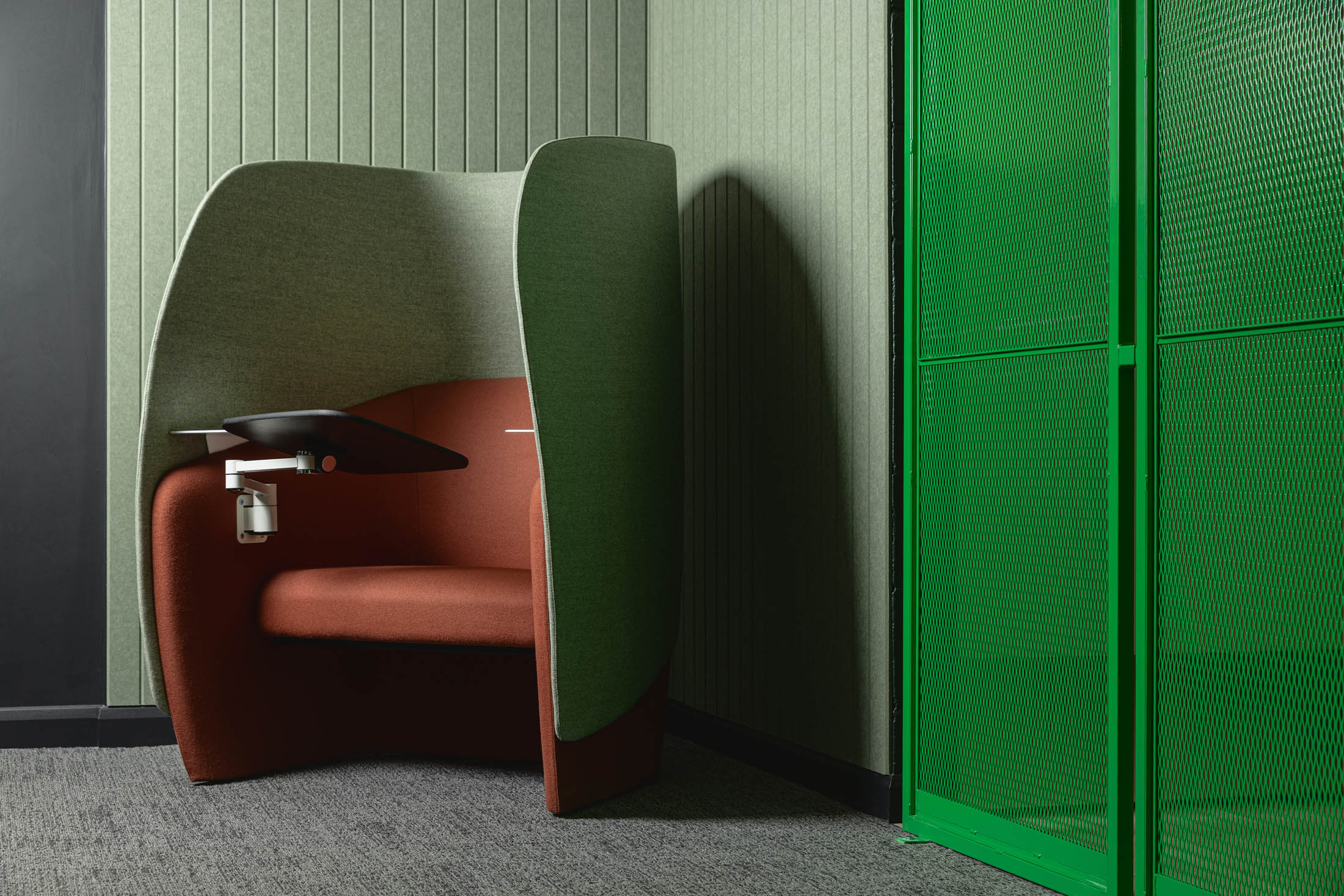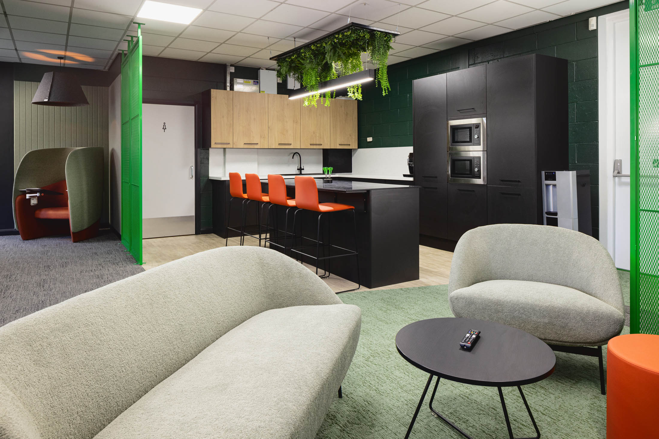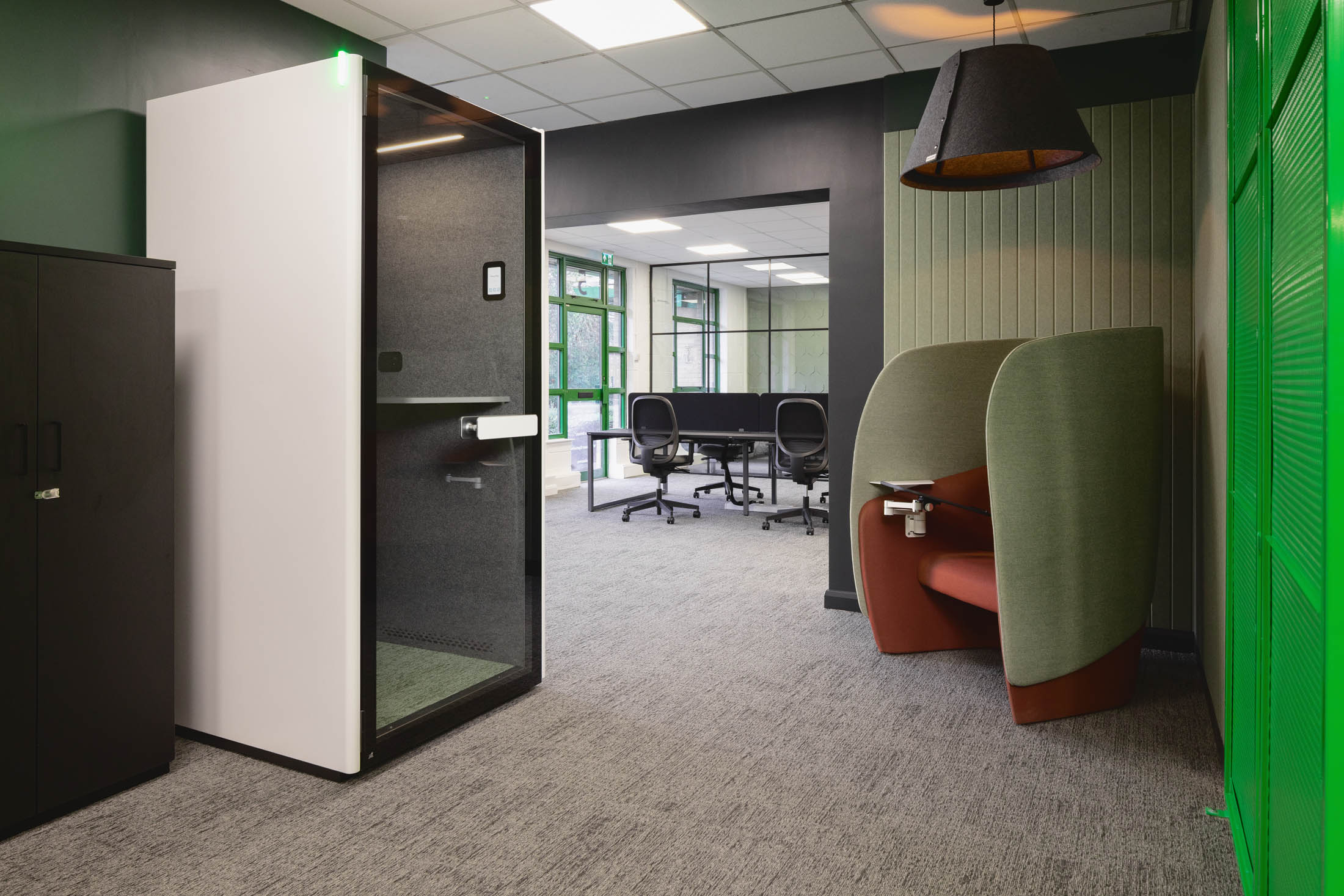 Alongside the main open plan workspace, we introduced a solo work pod and a phone booth to support private calls, focused tasks and quieter moments. This gave the team more choice in how they work across the day.