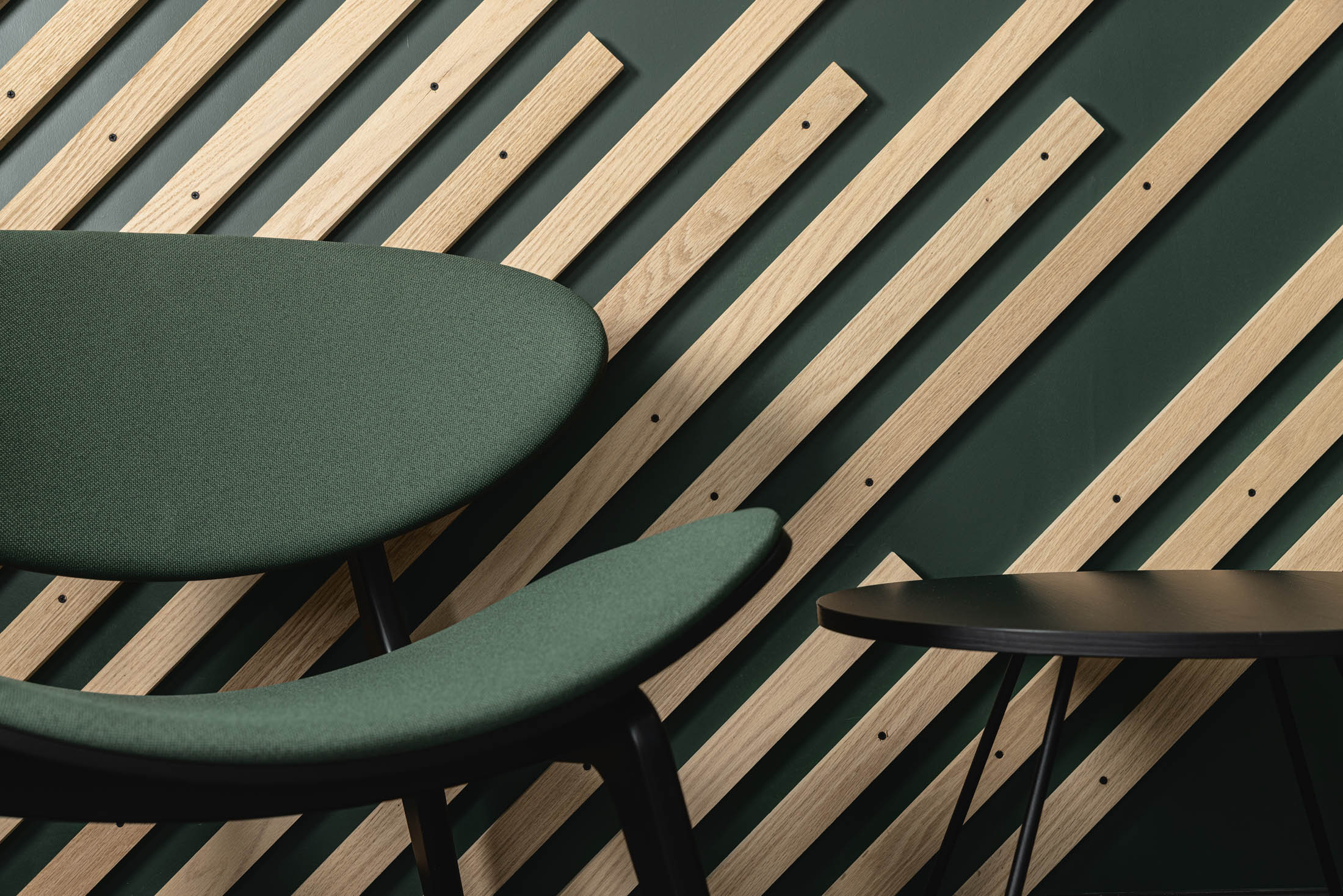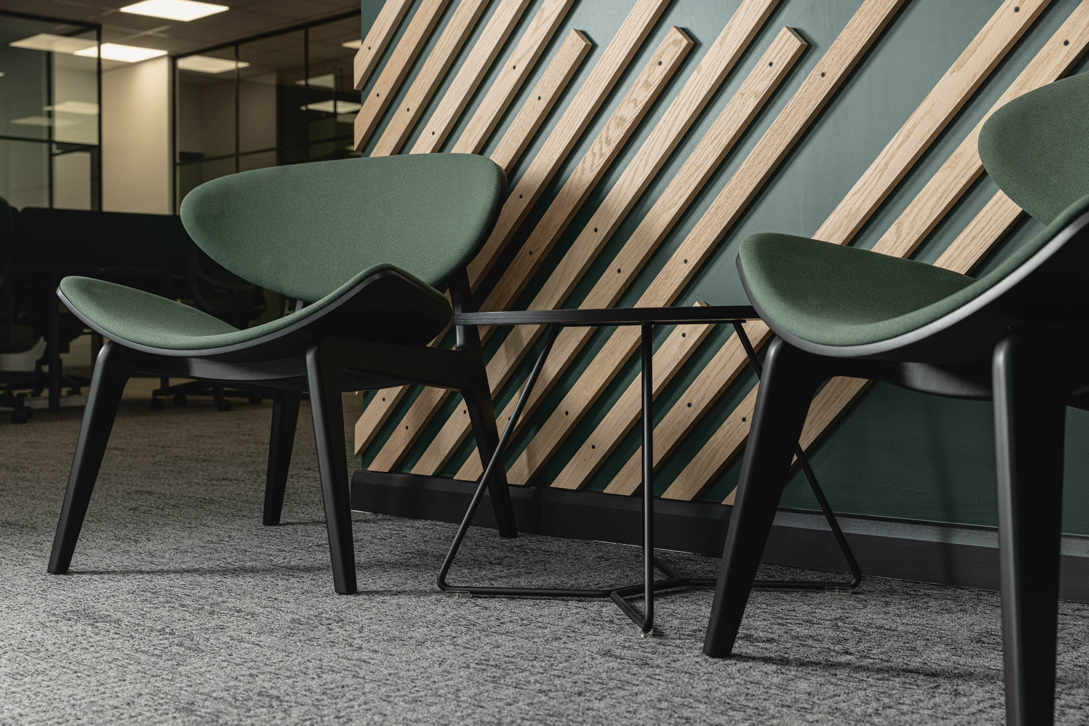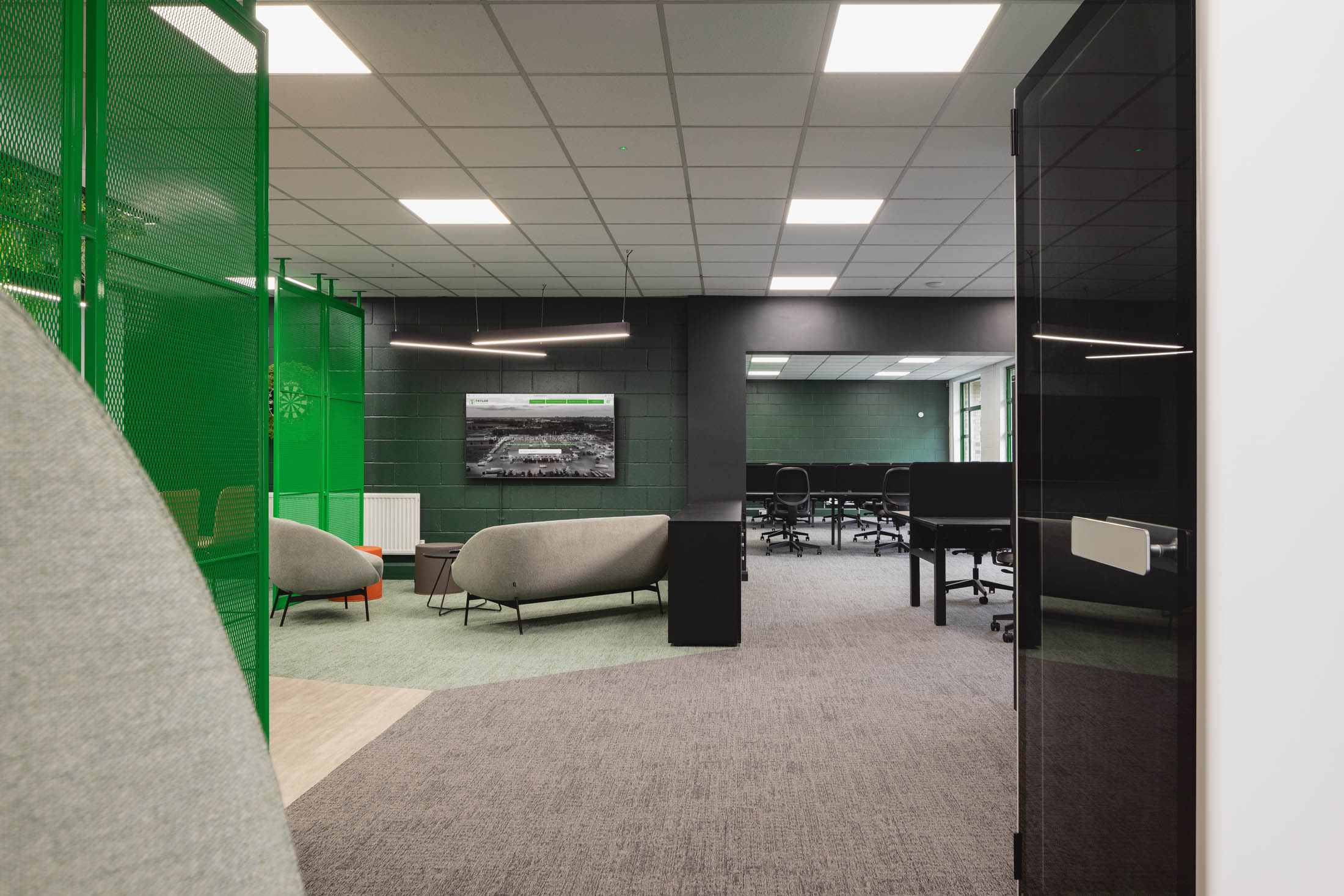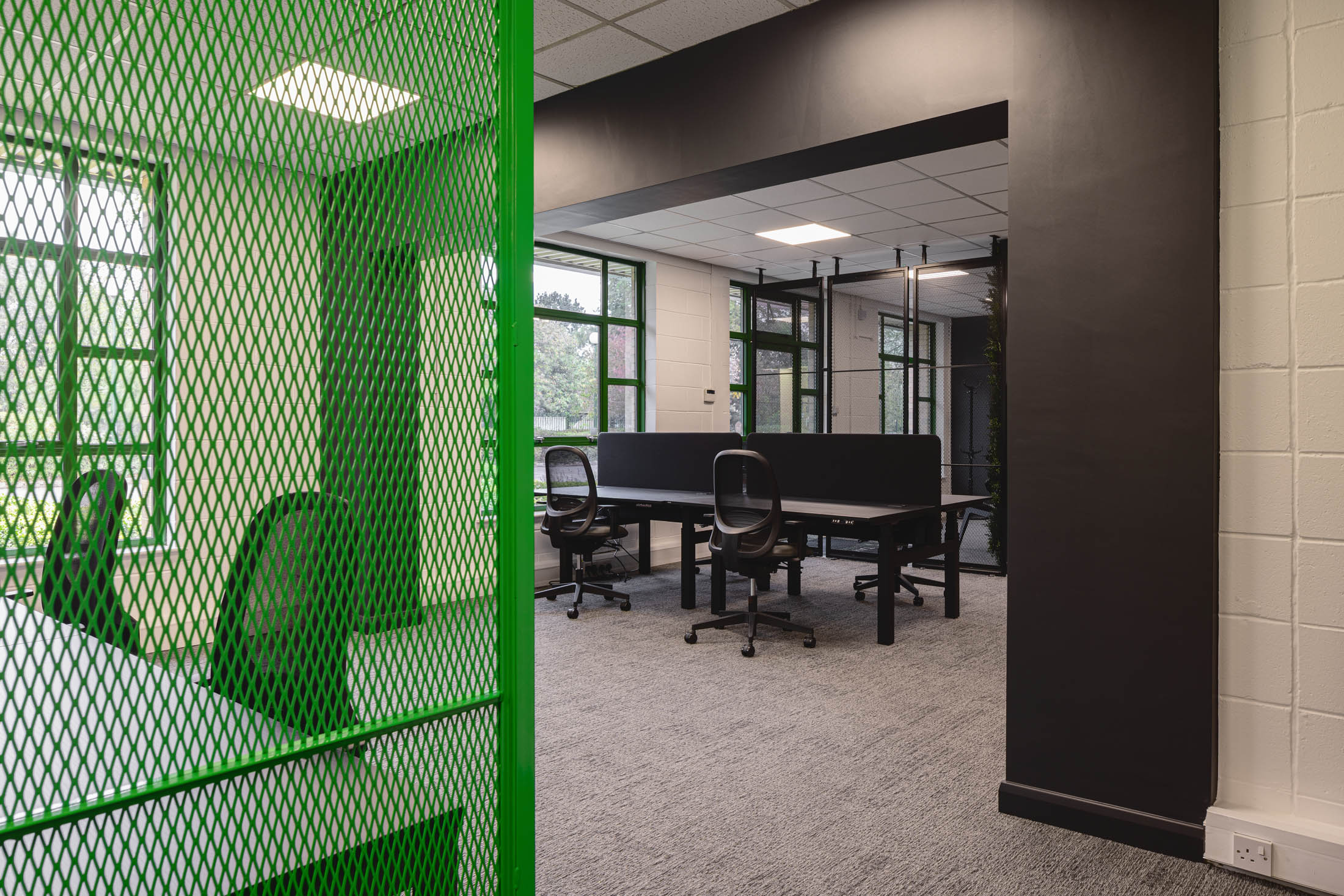 Mesh panels were used to divide areas and add a subtle industrial reference, tying back to the sectors the business recruits within. Acoustic elements and material choices were added to reduce noise and bring more texture and depth to the interior.