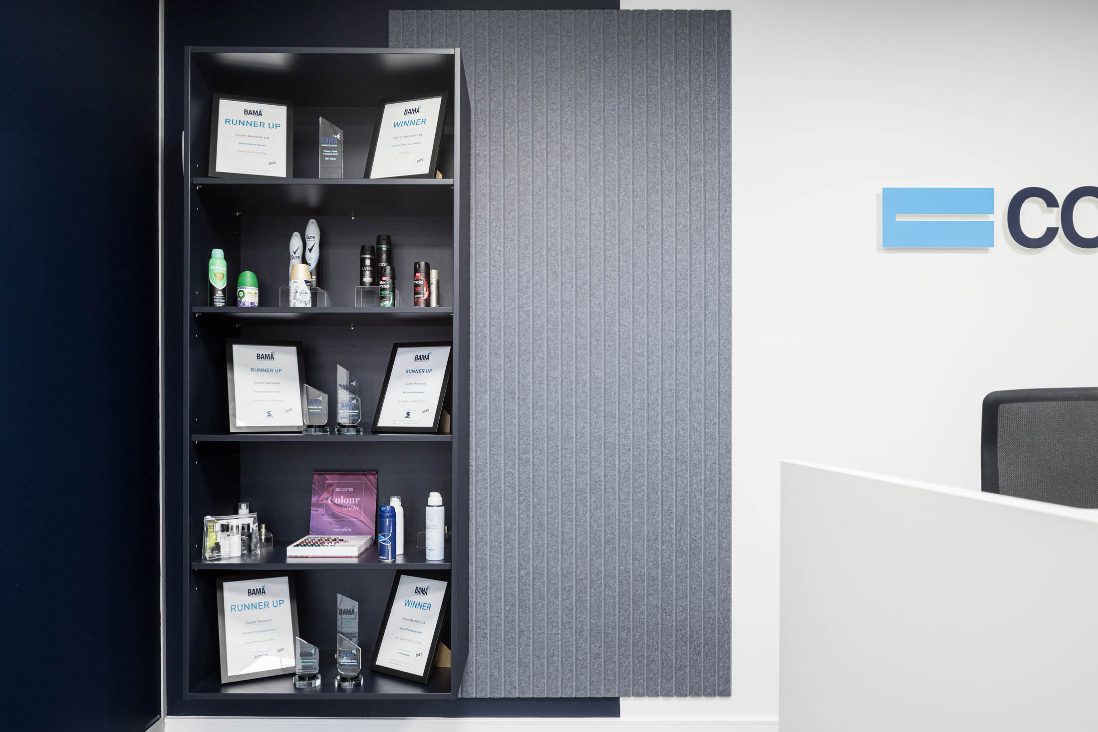 We installed a bespoke display unit and acoustic wall panel to add visual depth and help soften sound within the reception area.